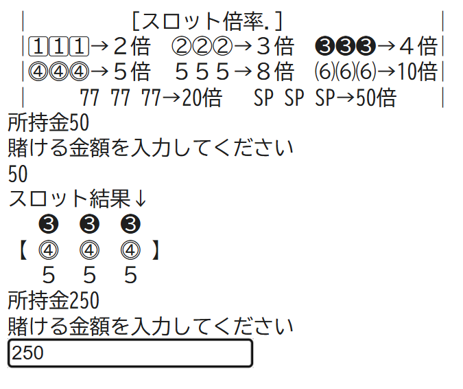 Google Colab上で動くスロットマシーンをpythonを使い作りました。 所持金以内を賭けていき、絵柄をそろえるとそれに対応した倍率になってお金が返ってきます。